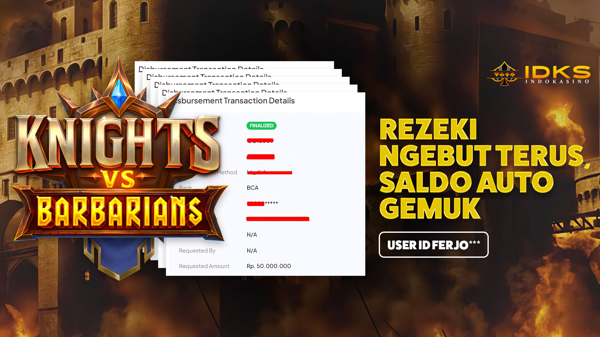 Kemenangan super member INDOKASINO kembali menjadi sorotan utama di dunia slot online Indonesia. Kali ini, seorang member dengan user ID FERJO* berhasil mencetak prestasi luar biasa dengan total kemenangan mencapai 250 juta rupiah melalui permainan Knights vs Barbarians dari provider ternama Pragmatic Play.